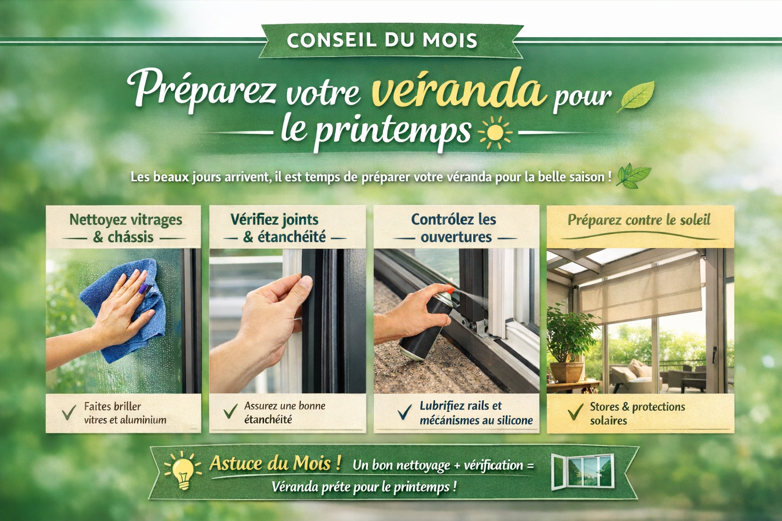 Astuce du mois : Un entretien rapide (nettoyage + vérification des joints et mécanismes) suffit pour que votre véranda soit prête à accueillir le printemps en toute sérénité.